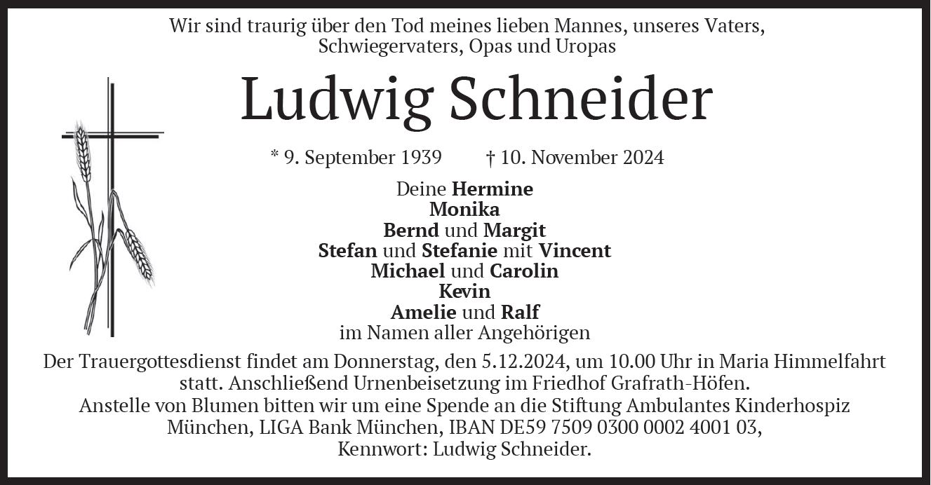 statt. Anschließend Urnenbeisetzung im Friedhof Grafrath-Höfen. Anstelle von Blumen bitten wir um eine Spende an die Stiftung Ambulantes Kinderhospiz München, LIGA Bank München, IBAN DE59 7509 0300 0002 4001 03, Kennwort: Ludwig Schneider. |