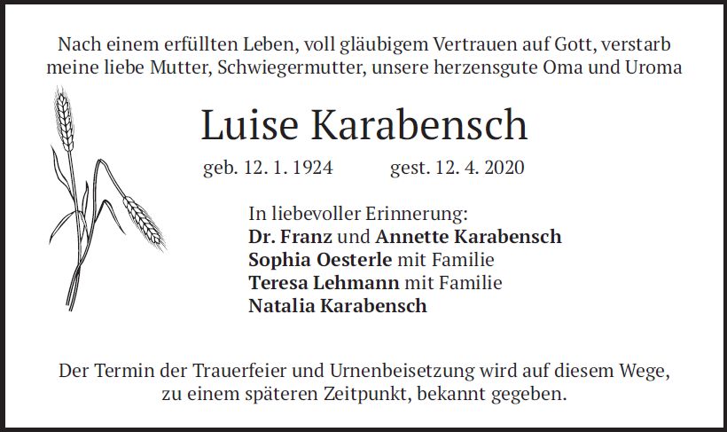 Die Trauerfeier und Urnenbeisetzung findet zu einem späteren Zeitpunkt statt.