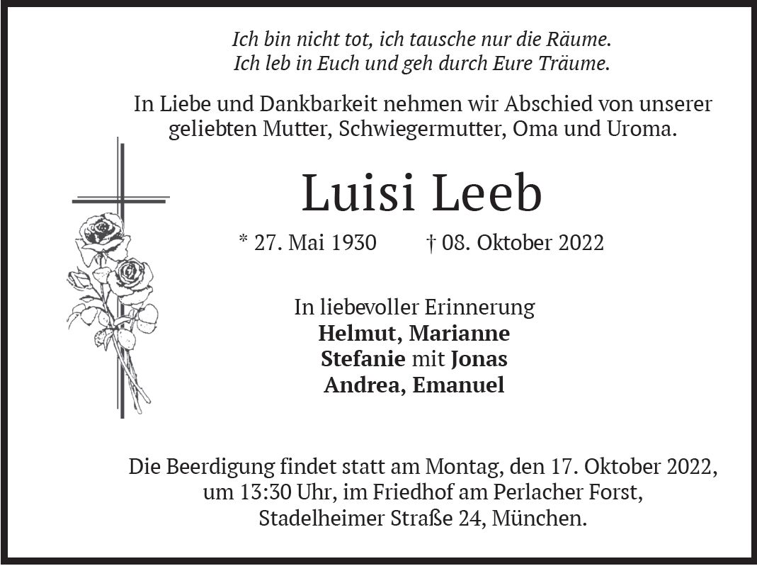Beerdigung am Montag, den 17. Oktober 2022, um 13:30 Uhr im Friedhof am Perlacher Forst