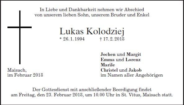Der Gottesdienst mit anschließender Beerdigung findet am Freitag, den 23.Februar 2018 um 10.00 Uhr in St. Vitus, Maisach statt.