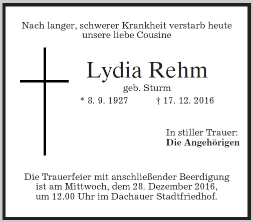 Wir trauern um Frau Lydia Rehm geb. Sturm * 08.09.1927 † 17.12.2016 |
