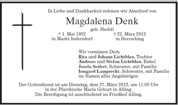 Der Gottesdienst ist am Dienstag, dem 27. März 2012, um 11:00 Uhr in der Kirche Mariä Geburt in Alling. Die Beerdigung ist anschließend im Friedhof Alling.