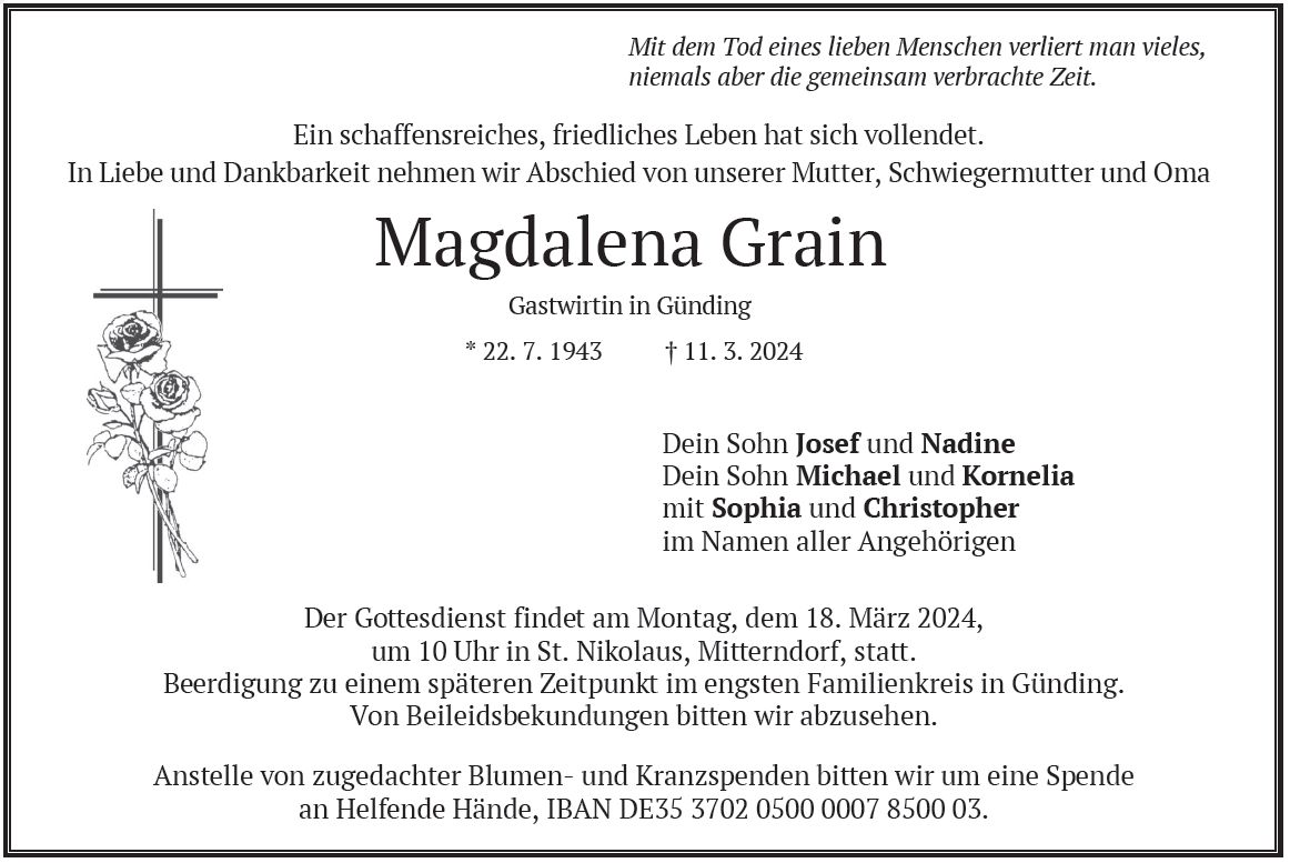 Wir trauern um Frau Magdalena Grain geb. Feldl * 22.07.1943 † 11.03.2024 |