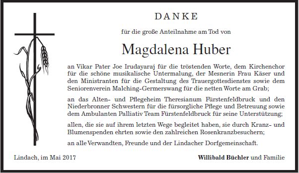 Gottesdienst und anschließende Beerdigung am Donnerstag, dem 4. Mai 2017, um 14:00 Uhr in St. Margaret, Malching Rosenkranz am Mittwoch, den 03. Mai 2017 um 19:00 Uhr in St. Margaret, Malching