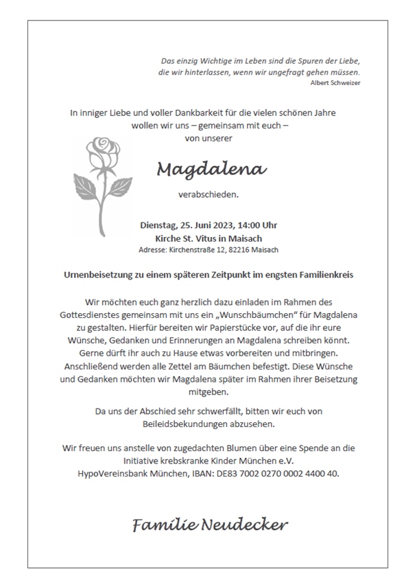 Abschieds-Gottesdienst am Dienstag, dem 25. Juli 2023, um 14:00 Uhr in St. Vitus, Maisach.