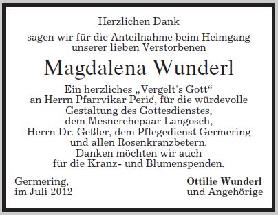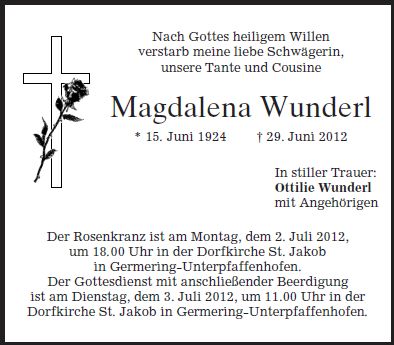 Der Rosenkranz ist am Montag, dem 2.7.2012 um 18.00 Uhr in der Dorfkirche St. Jakob in Germering-Unterpfaffenhofen. Der Gottesdienst mit anschließender Beerdigung ist am Dienstag, dem 4.7.2012 um 11:00 Uhr in St. Jakob in Germering-Unterpfaffenhofen. |