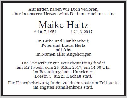 Trauerfeier am Mittwoch, dem 29. März 2017, um 14:00 Uhr im Hanrieder Bestattungshaus, Loestr. 5, 85221 Dachau. Die Urnenbeisetzung findet zu einem späteren Zeitpunkt im engsten Familienkreis statt.