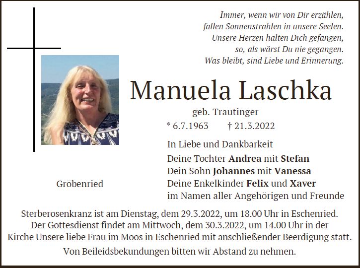 Gottesdienst am Mittwoch, dem 30. März 2022, um 14:00 Uhr in der Kirche Unsere liebe Frau im Moos, Eschenried. Beerdigung am Mittwoch, dem 30. März 2022, um 14:45 Uhr im Friedhof Eschenried.