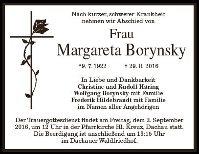 Der Gottesdienst findet am Freitag, dem 2. September 2016, um 12 Uhr in Hl. Kreuz, Dachau statt. Die Beerdigung ist anschließend um 13:15 Uhr im Dachauer Waldfriedhof.