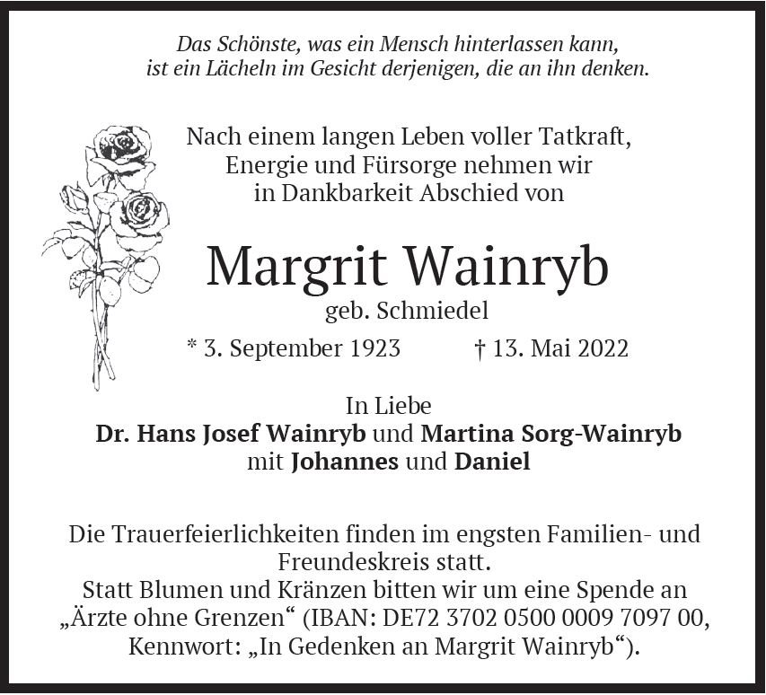 Statt Blumen und Kränzen bitten wir um eine Spende an „Ärzte ohne Grenzen“ (IBAN: DE72 3702 0500 0009 7097 00, Kennwort: „In Gedenken an Margrit Wainryb“). |