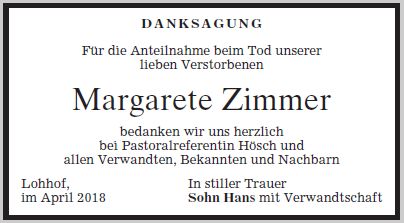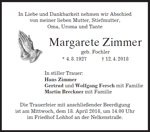 Wir trauern um Frau Margareta Zimmer geb. Fochler Hausfrau * 04.08.1927 † 12.04.2018 |