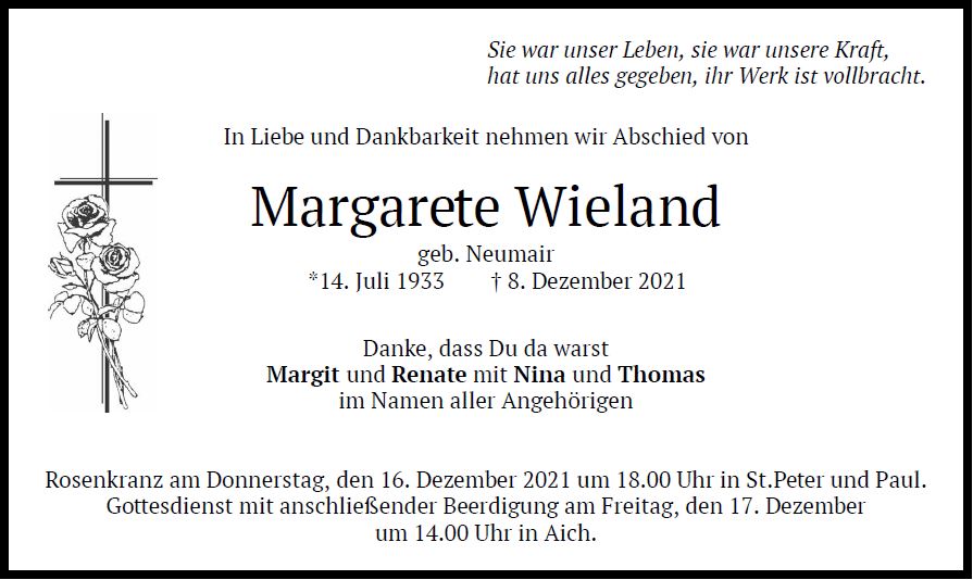 Wir trauern um Frau Margarete Wieland geb. Neumair * 14.07.1933 † 08.12.2021 |