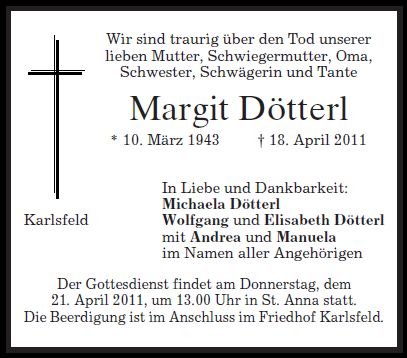 Der Gottesdienst findet am Donnerstag, dem 21. April 2011, um 13:00 Uhr in St. Anna Karlsfeld statt. Die Beerdigung ist anschließend um 14:00 Uhr im Friedhof Karlsfeld.