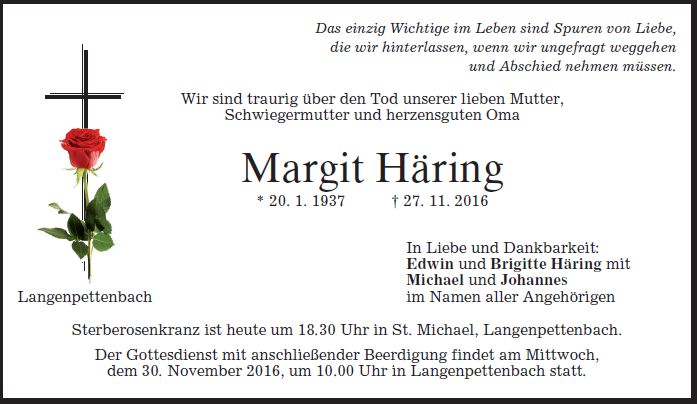 Wir trauern um Frau Margit Häring geb. Fritsch Hausfrau * 20.01.1937 † 27.11.2016 |