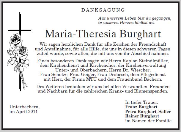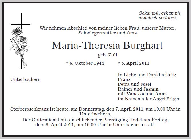 Gottesdienst mit anschließender Beerdigung am Freitag, dem 8. April 2011, um 10:00 Uhr in Unterbachern.
