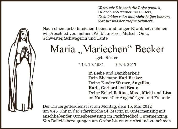 Der Trauergottesdienst ist am Montag, dem 15. Mai 2017, um 9.45 Uhr in der Pfarrkirche St. Martin in Untermenzing mit anschließender Urnenbeisetzung im Parkfriedhof Untermenzing. |