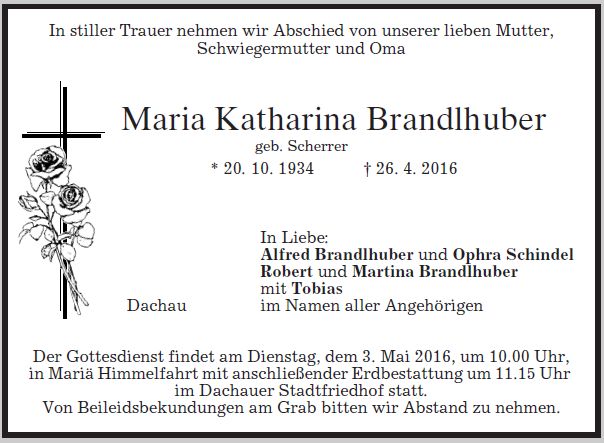 Gottesdienst am Dienstag, dem 3. Mai 2016, um 10:00 Uhr in Mariä Himmelfahrt. Beerdigung am Dienstag, dem 3. Mai 2016, um 11:15 Uhr im Dachauer Stadtfriedhof.