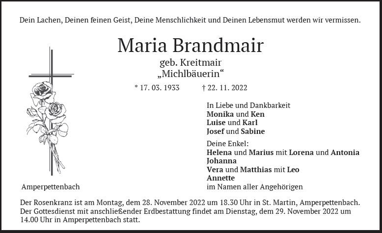 Gottesdienst am Dienstag, dem 29. November 2022, um 14:00 Uhr in St. Martin, Amperpettenbach. Beerdigung am Dienstag, dem 29. November 2022, um 14:45 Uhr im Friedhof Amperpettenbach.
