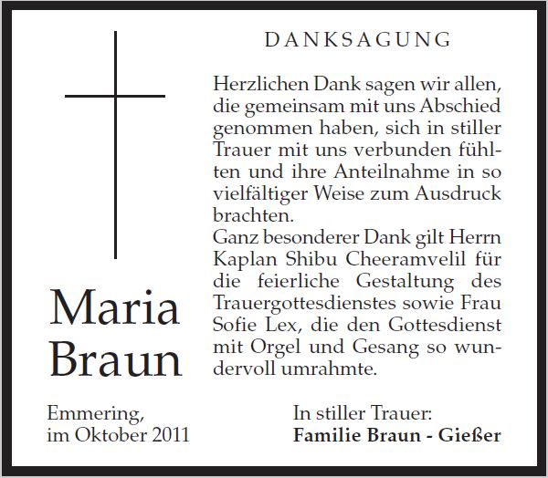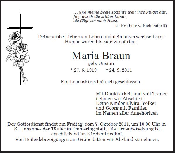Gottesdienst mit anschließender Urnenbeisetzung am Freitag, dem 7. Oktober 2011, um 10:00 Uhr in St. Johannes der Täufer in Emmering.