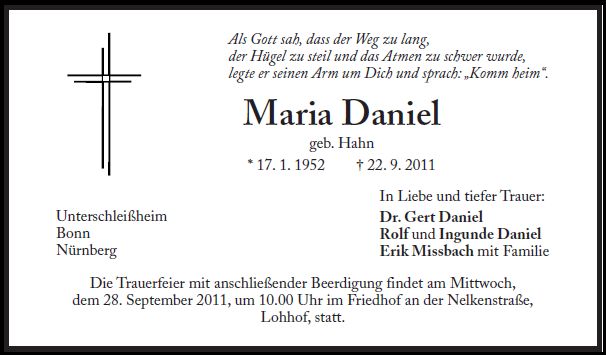 Wir trauern um Frau Maria Daniel geb. Hahn Kursleiterin * 17.01.1952 † 22.09.2011 |