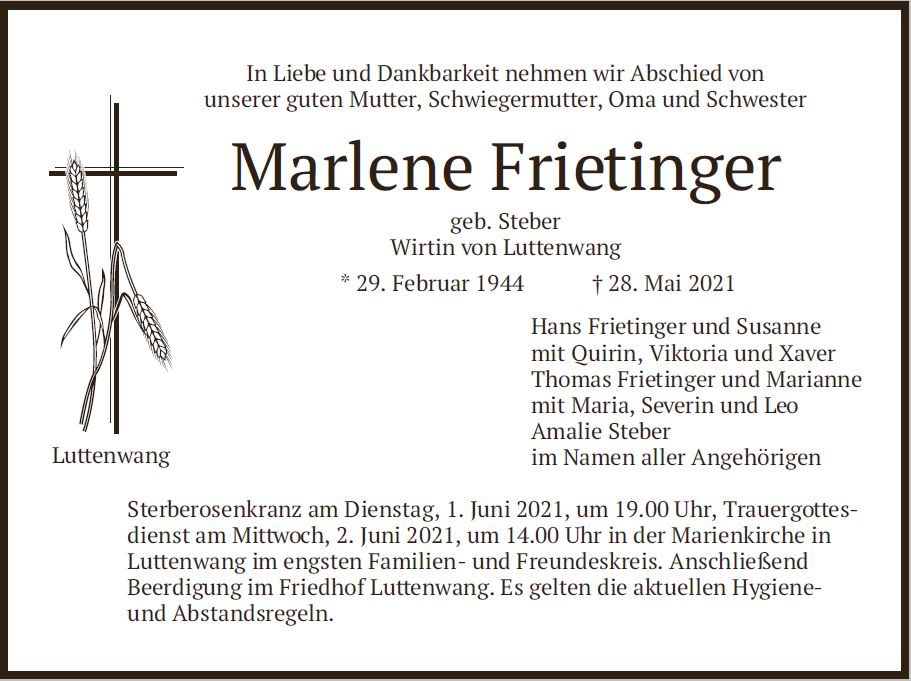 Wir trauern um Frau Marlene Frietinger geb. Steber Wirtin von Luttenwang * 29.02.1944 † 28.05.2021 |