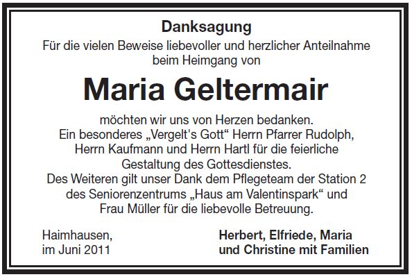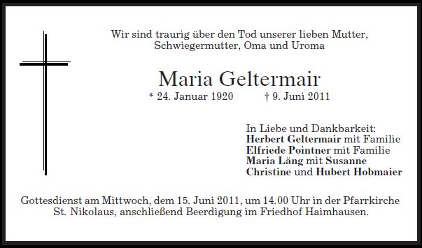 Gottesdienst am Mittwoch, dem 15. Juni 2011, um 14:00 Uhr in St. Nikolaus, in Haimhausen Beerdigung anschließend im Friedhof Haimhausen
