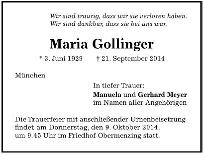 Die Trauerfeier mit anschließender Urnenbeisetzung findet am Donnerstag, den 9. Oktober 2014, um 09:45 Uhr im Friedhof Obermenzing statt. |