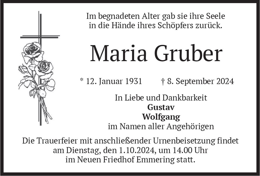 Wir trauern um Frau Maria Gruber * 12.01.1931 † 08.09.2024 |