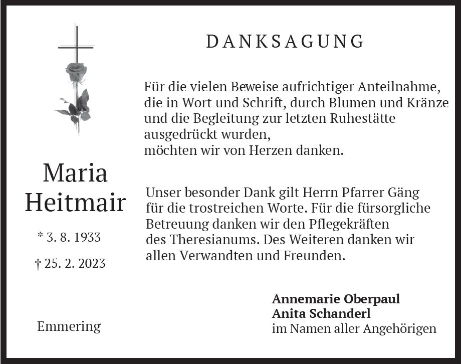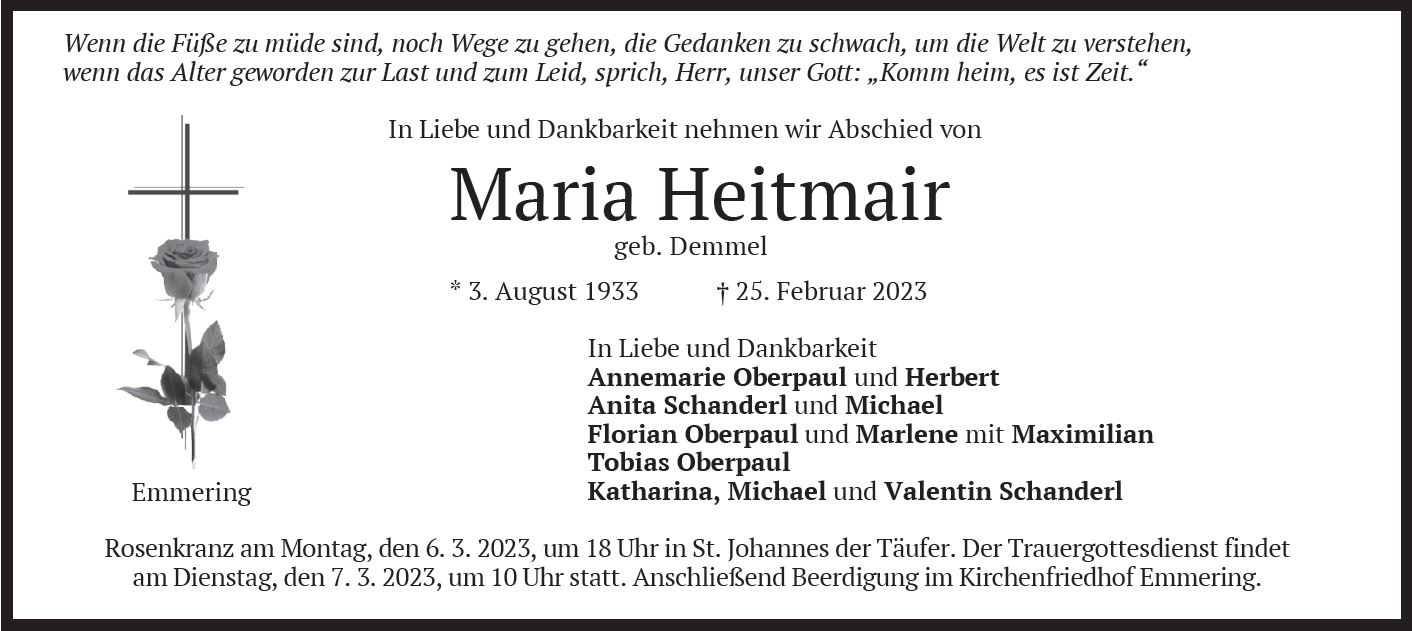 Wir trauern um Frau Maria Heitmair geb. Demmel * 03.08.1933 † 25.02.2023 |