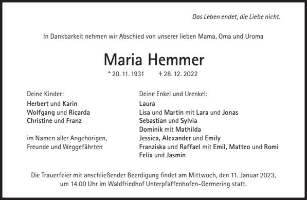Wir trauern um Frau Maria Hemmer geb. Müller * 20.11.1931 † 28.12.2022 |