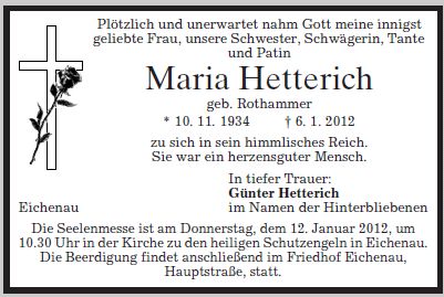 Gottesdienst am Donnerstag, dem 12.1.2012 um 10:30 Uhr in der Schutzengelkirche in Eichenau. Die Beerdigung ist anschließend im Friedhof Eichenau.