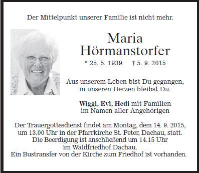 Der Gottesdienst findet am Montag, dem 14. September 2015, um 13 Uhr in St. Peter, Dachau statt. Die Beerdigung ist anschließend um 14:15 Uhr im Dachauer Waldfriedhof.