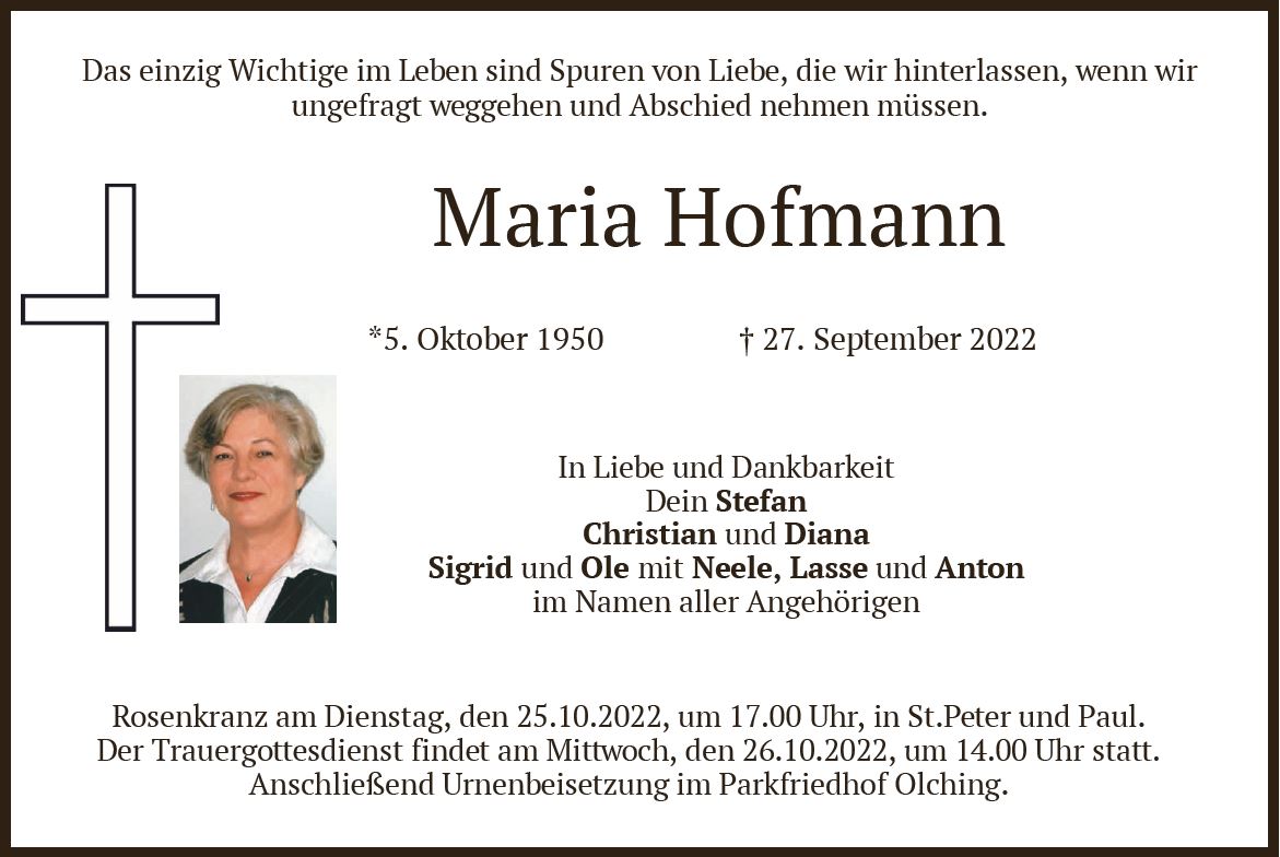Wir trauern um Frau Maria Hofmann geb. Böck * 05.10.1950 † 27.09.2022 |