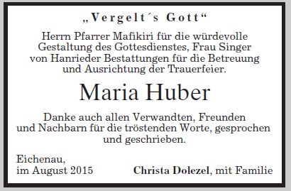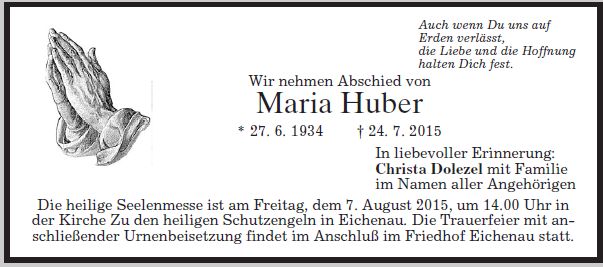 Wir trauern um Frau Maria Huber geb. Schönberger Hausfrau * 27.06.1934 † 24.07.2015 |