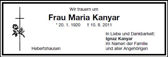 Wir trauern um Frau Maria Kanyar geb. Kollmair Hausfrau * 20.01.1920 † 10.08.2011 |