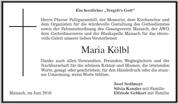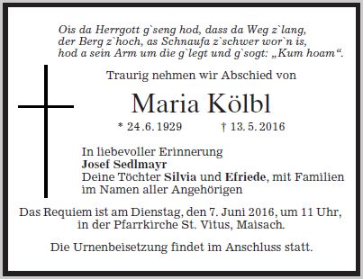 Das Requiem ist am Dienstag, den 7. Juni 2016 um 11 Uhr, in der Pfarrkirche St. Vitus, Maisach Die Urnenbeisetzung findet im Anschluss im Friedhof St. Vitus in Maisach statt.