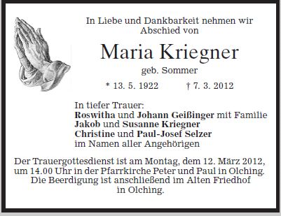 Der Gottesdienst ist am Montag, dem 12. März 2012, um 14:00 Uhr in der Parrkirche Peter und Paul in Olching. Die Beerdigung ist anschließend im alten Friedhof in Olching.