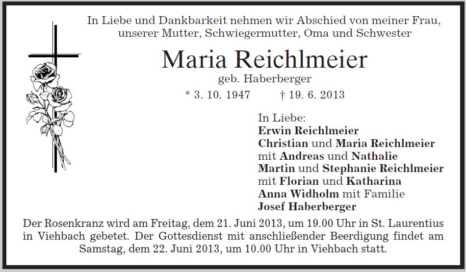 Frau Maria Reichlmeier geb. Haberberger