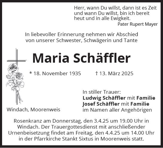 Wir trauern um Frau Maria Schäffler * 18.11.1935 † 13.03.2025 |