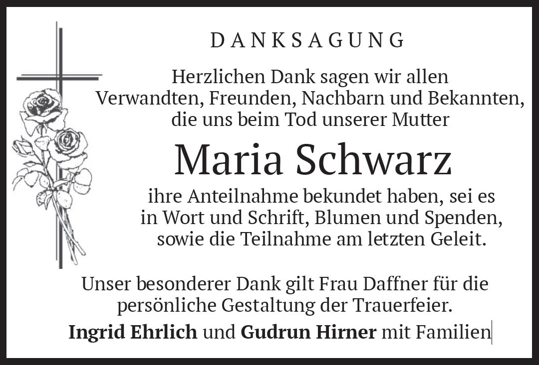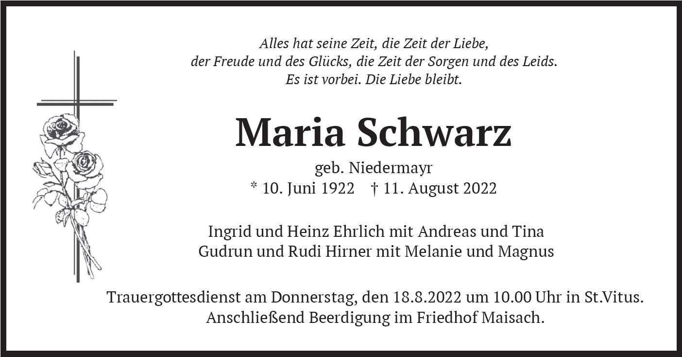 Wir trauern um Frau Maria Schwarz geb. Niedermayr * 10.06.1922 † 11.08.2022 |