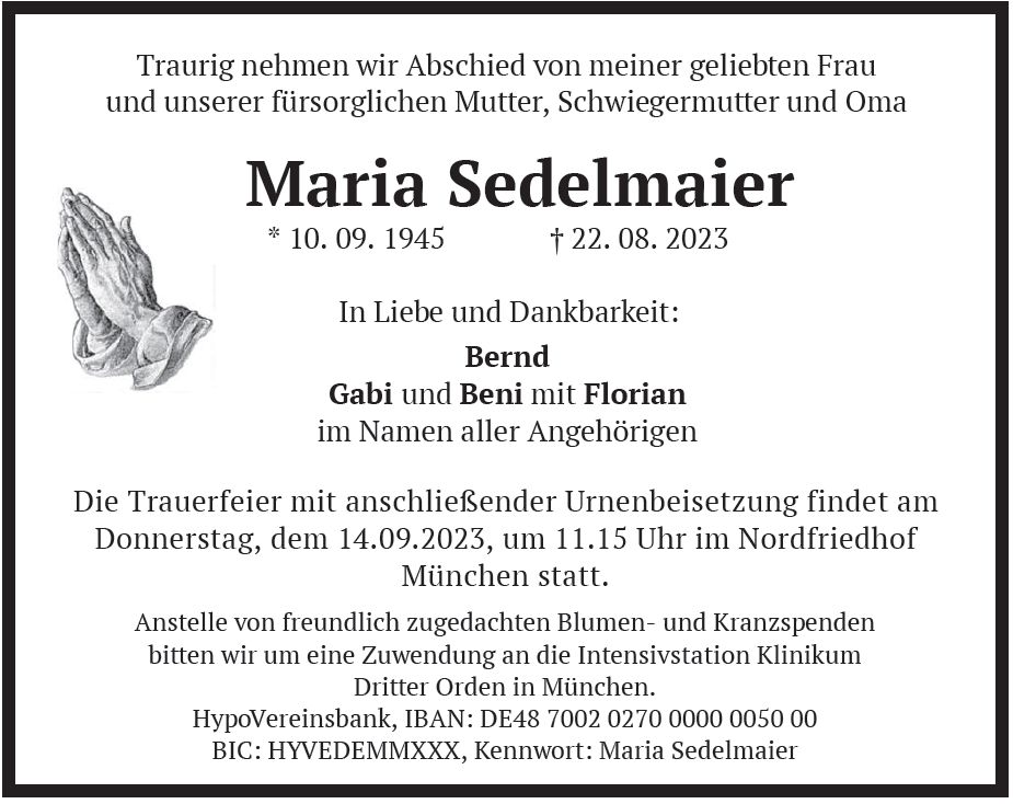 Wir trauern um Frau Maria Sedelmaier Geschäftsfrau * 10.09.1945 † 22.08.2023 |