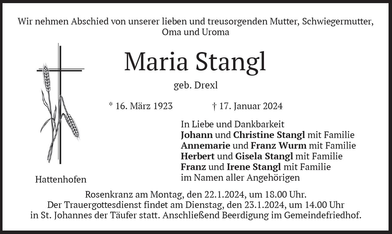 Wir trauern um Frau Maria Stangl geb. Drexl * 16.03.1923 † 17.01.2024 |