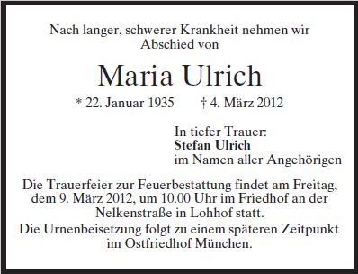 Die Trauerfeier zur Feuerbestattung findet am Freitag, dem 9. März 2012, um 10:00 Uhr im Friedhof an der Nelkenstraße in Lohhof statt. |
