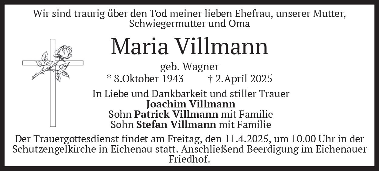 Wir trauern um Frau Maria Villmann geb. Wagner * 08.10.1943 † 02.04.2025 |