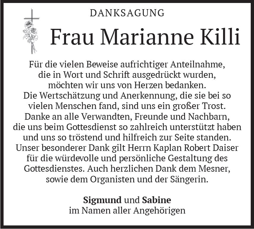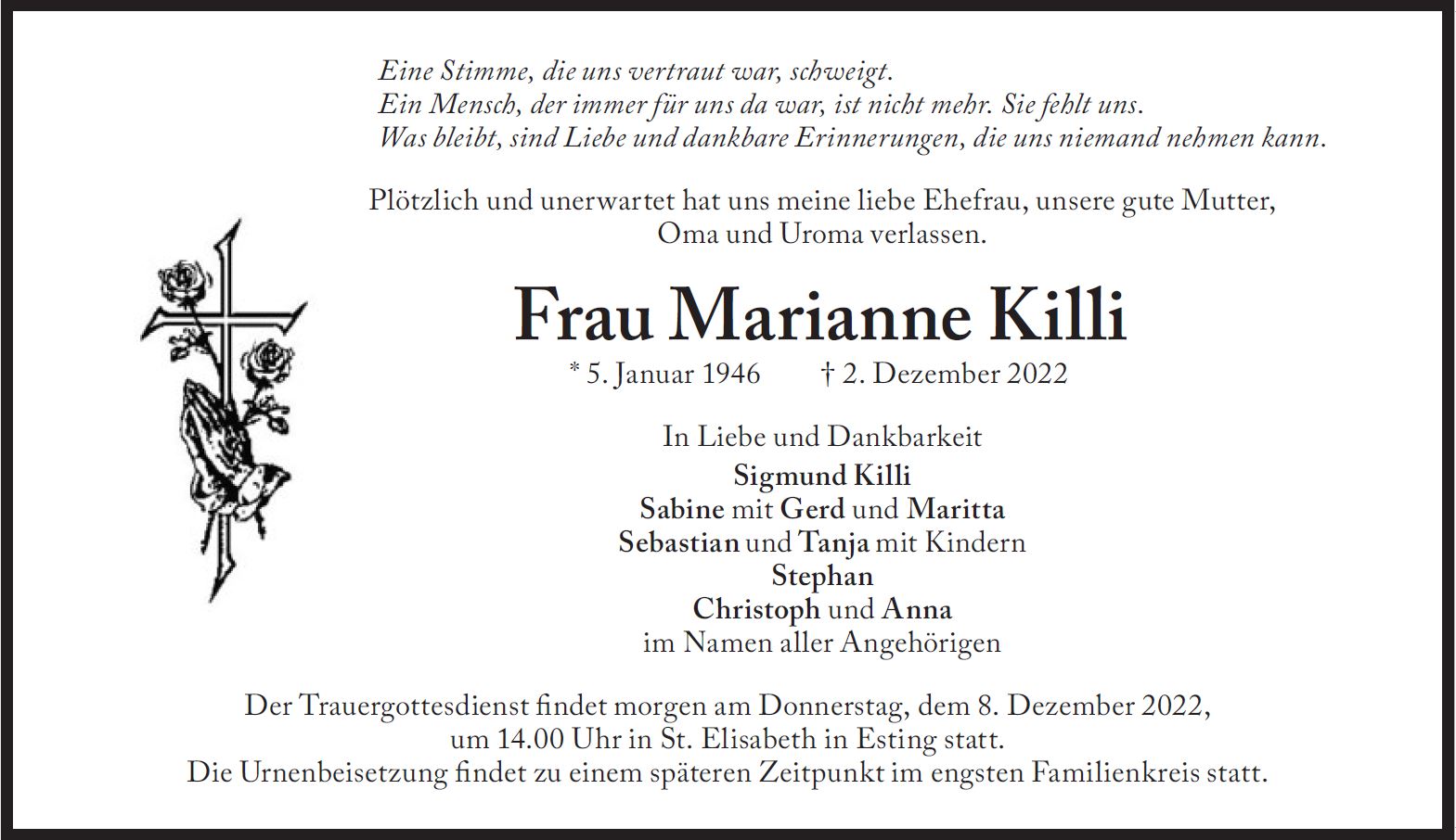 Wir trauern um Frau Marianne Killi * 05.01.1946 † 02.12.2022 |
