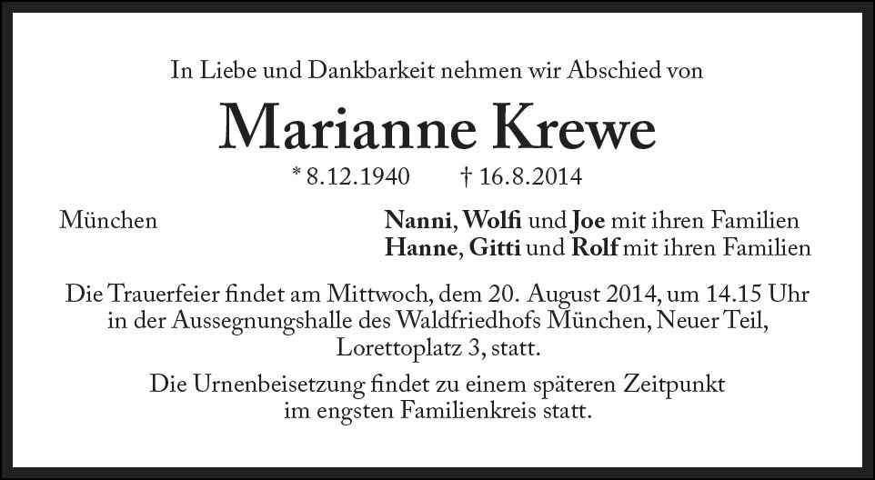Die Trauerfeier findet am Mittwoch, dem 20.8.2014, um 14.15 Uhr in der Aussegnungshalle des Waldfriedhofs München, neuer Teil, Lorettoplatz 3, statt. |