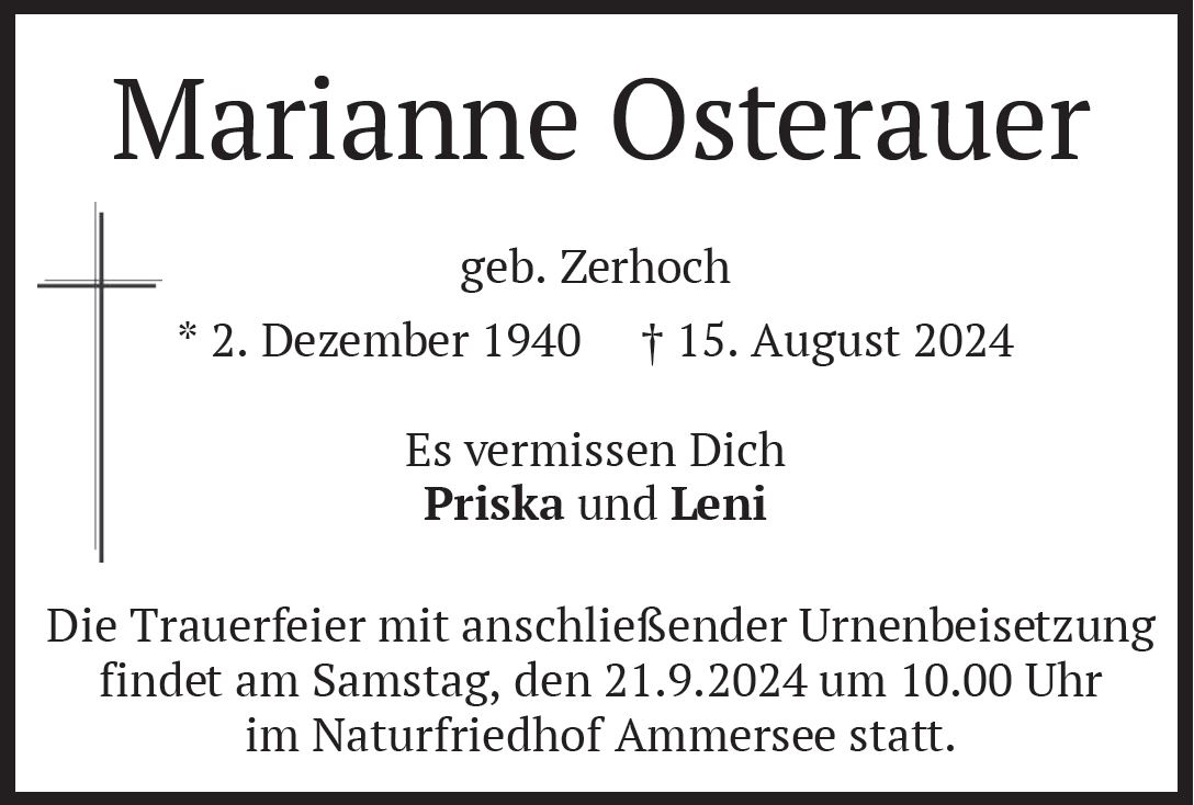 Wir trauern um Frau Marianne Osterauer geb. Zerhoch * 02.12.1940 † 15.08.2024 |