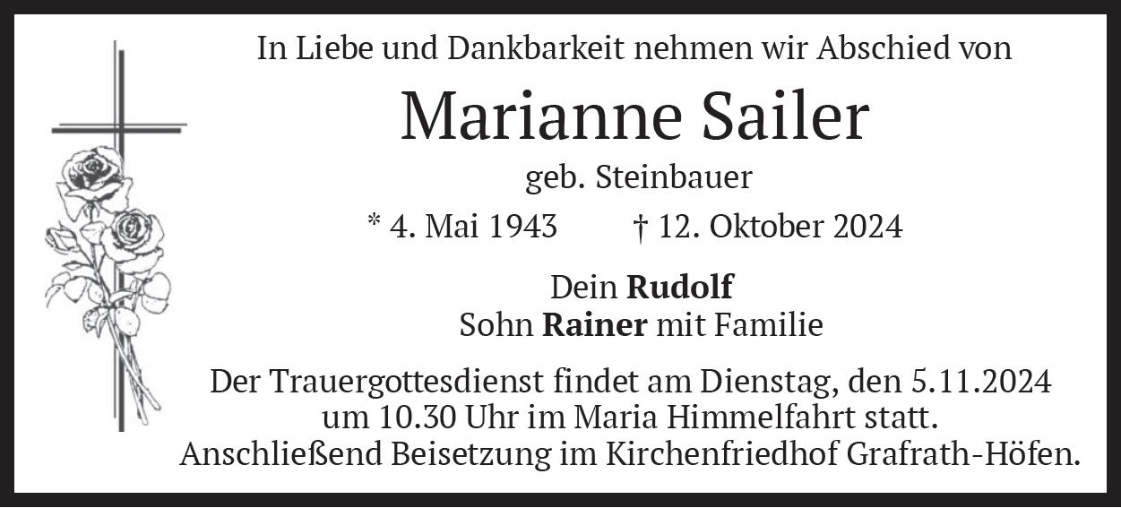 Wir trauern um Frau Marianne Sailer geb. Steinbauer * 04.05.1943 † 12.10.2024 |