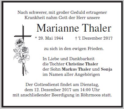 Gottesdienst mit anschließender Beerdigung am Dienstag, dem 12. Dezember 2017, um 14:00 Uhr in St. Johannes der Täufer in Röhrmoos