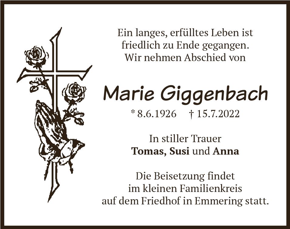 Die Beisetzung findet im kleinen Familienkreis auf dem Friedhof in Emmering statt.